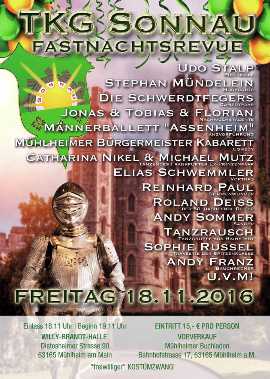 (Mühlheim) Am 18.11. eröffnet die TKG Sonnau e.V. mit der einer Fastnachtsrevue die "5. Jahreszeit" in der Mühlenstadt.