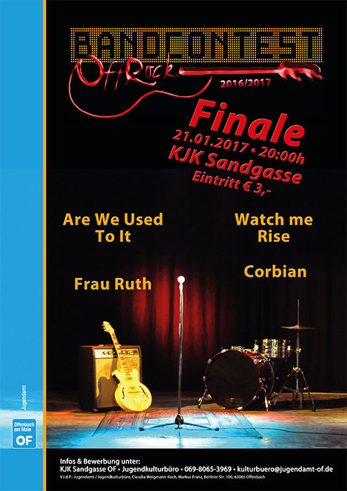 (Stadt Offenbach) "OffRock 2017" - alle zwei Jahre findet der Bandcontest für Stadt und Kreis Offenbach im KJK Sandgasse statt. Dieses Jahr standen mit "Frau Ruth" (Offenbach), "Watch me rise" (Langen), Corbian (Offenbach) und "Are we used to it" (Rodgau) vier Bands im Finale. Das komplette Konzert und die Interviews exklusiv auf OF-TV.